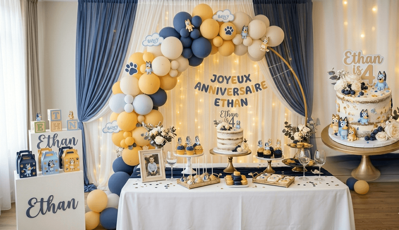 Une déco très chic, avec un bleu plus profond, idéal pour un baptême par exemple. On remplace le orange par du beige clair et du doré.
