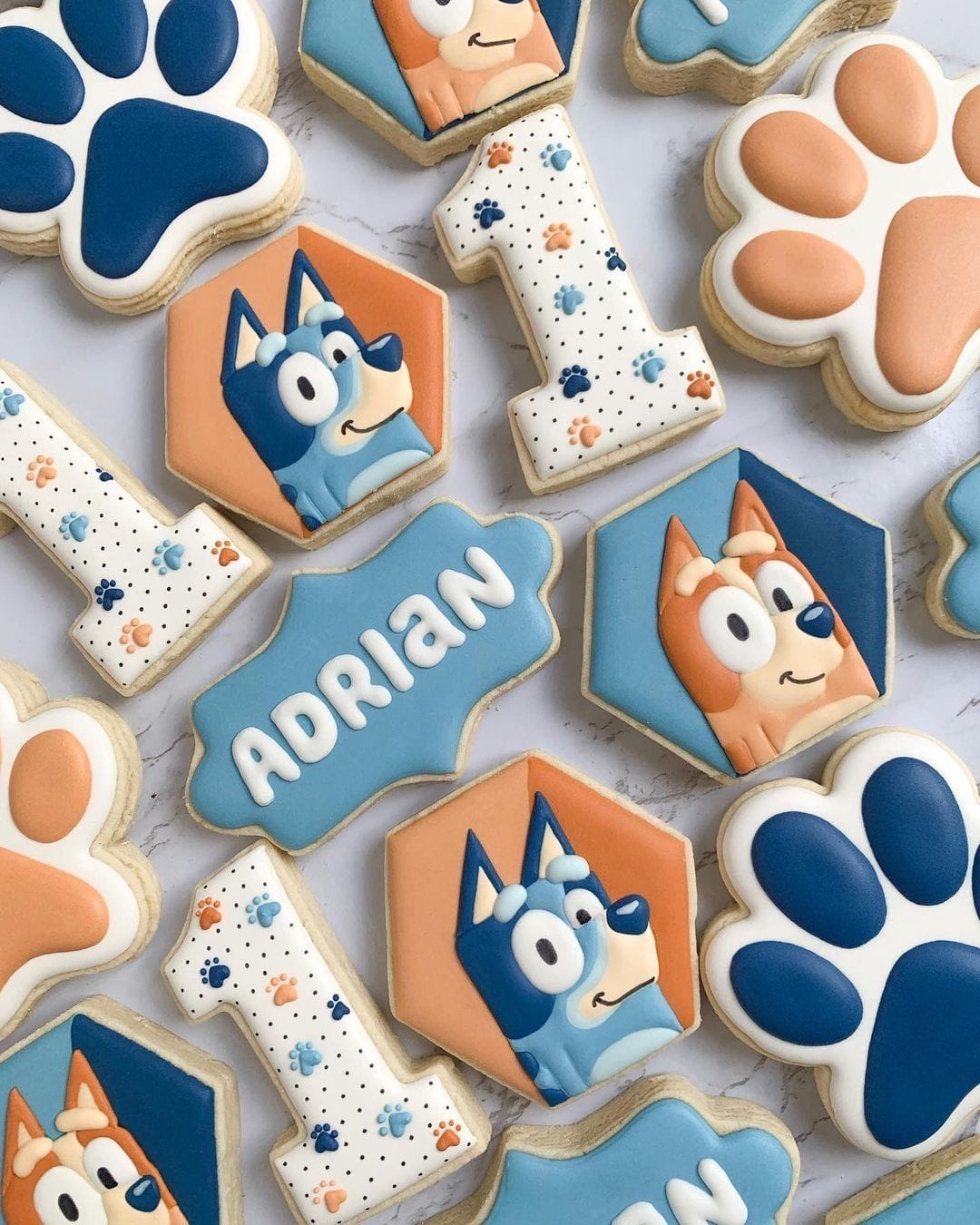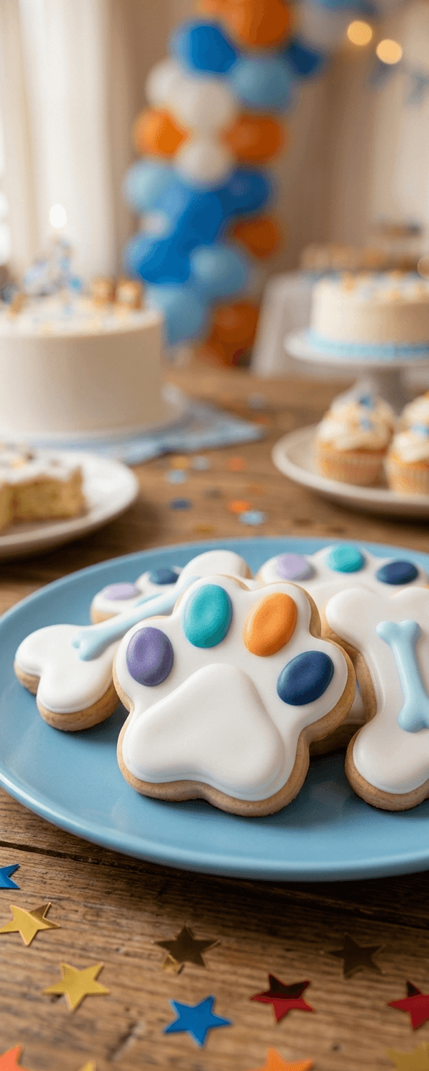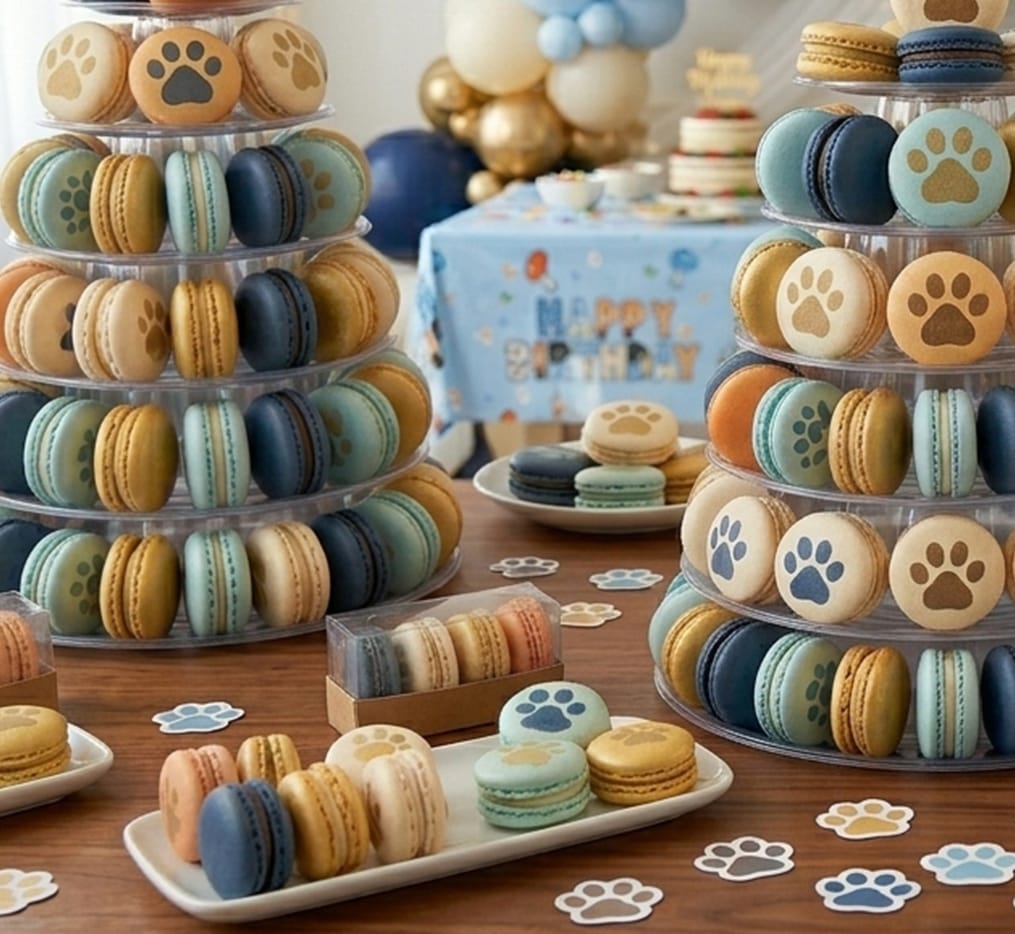 Des macarons colorés dans le thème avec des dessins de pattes de chiens.