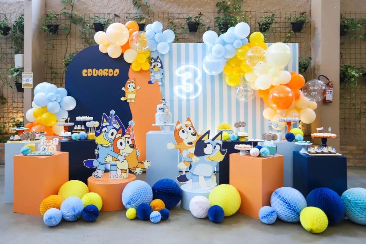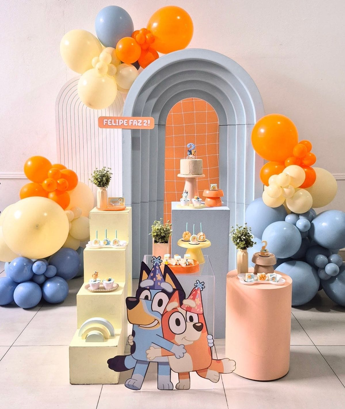 Une décoration colorée avec des ballons oranges, bleus et jaunes.